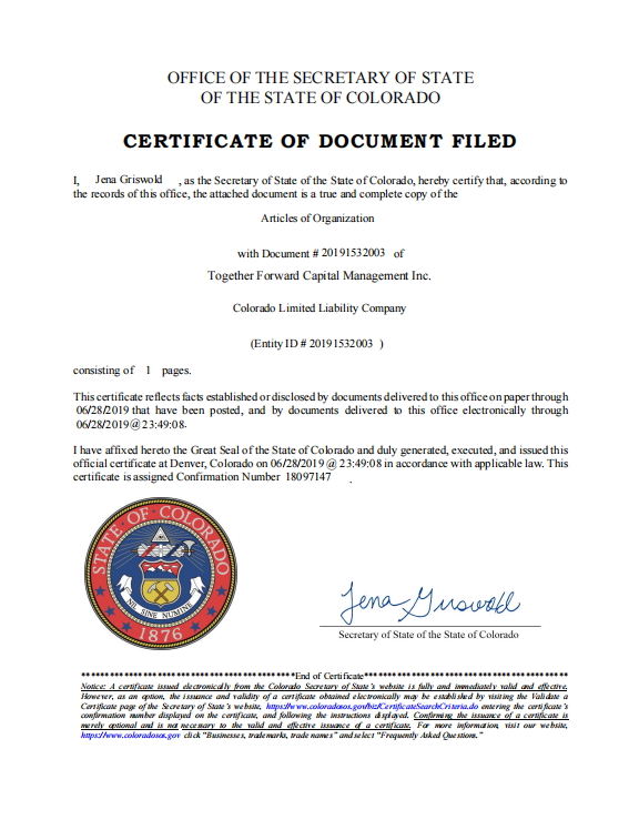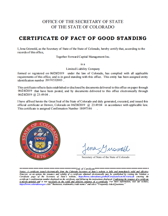 Business Entity Registration Status Inquiry (Colorado) Official Portal: https://www.sos.state.co.us/biz/BusinessEntityCriteriaExt.do Enter the company name Together Forward Capital Management Inc. in the search bar to check its registration status, incorporation date, and official filings.